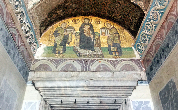 Eksperter mener, at gange og gallerier var dækket af mosaikker, og vi kan kun forestille os, hvordan her har set ud for mere end 1000 år siden. Flere af mosaikkerne findes stadig, og mest berømt er nok den af Jomfru Maria, der er flankeret af Konstantin og Justitian, som forærer hende henholdsvis byen Konstantinopel og Hagia Sophia.