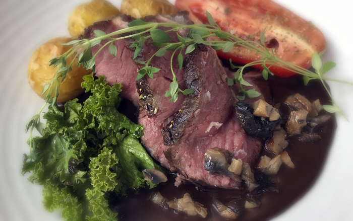 Heldigvis var maden god. Jeg fik en dejlig rosastegt oksesteg med en skøn svampesauce. Tilbehøret bestod bl.a. af kartofler og ovnbagt tomat. Til dessert prøvede vi lidt forskelligt – middagen blev således afsluttet med en dejlig panna cotta med æblesorbet og tre slags oste.