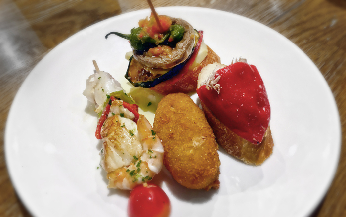 Her får du gode pintxos (4-6 €) som du kan vælge fra montren eller tjekke på tavlerne. Der er også egentlige retter som f.eks. kroketter, patatas bravas og iberisk skinke samt et udvalg af oste. Nogle af retterne kan deles ved bordet, og det er således en god måde at smage noget forskelligt.